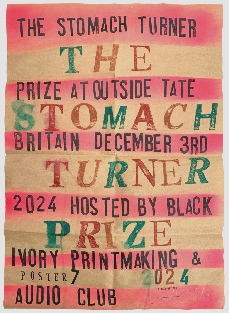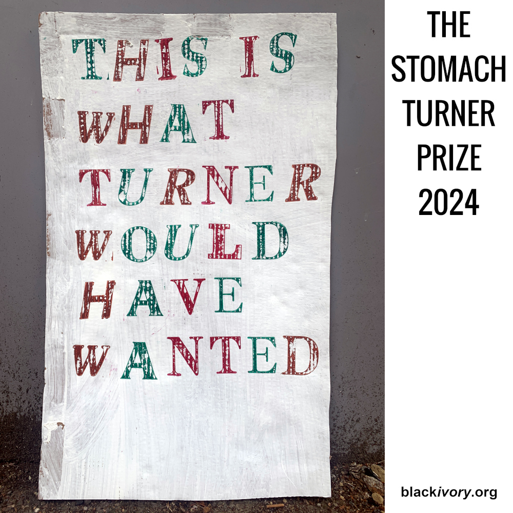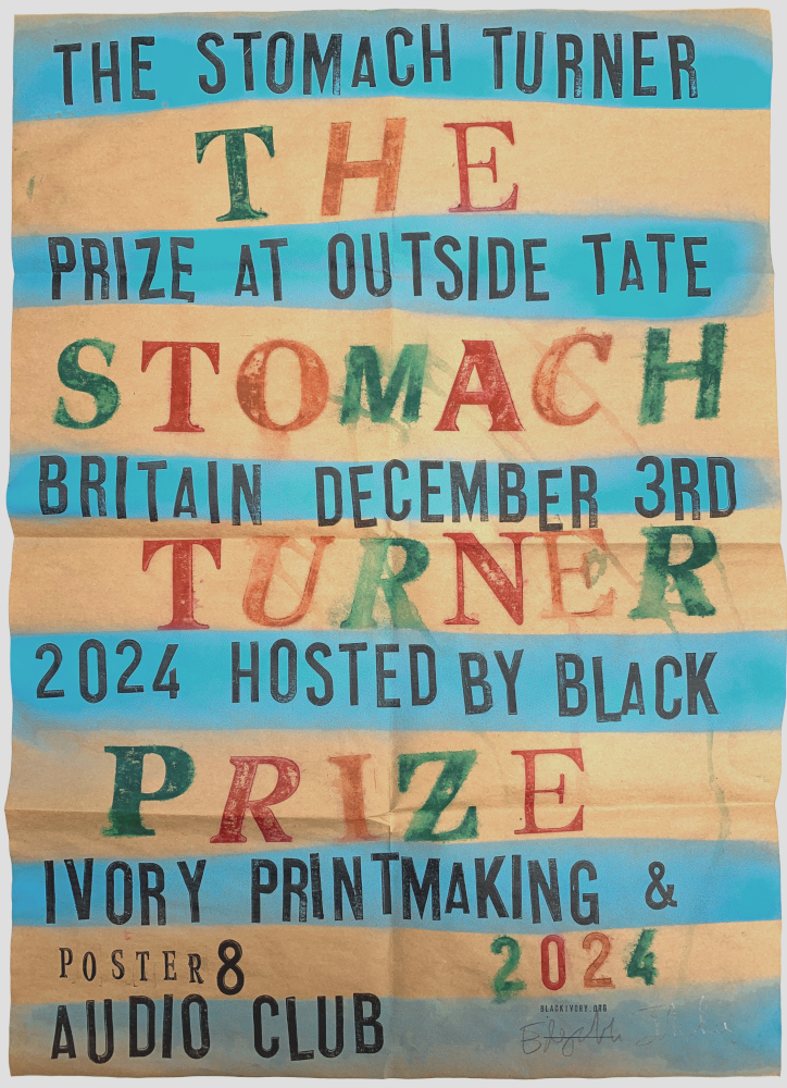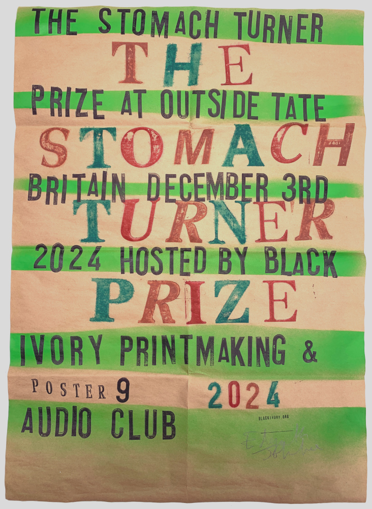 The presentation of The Stomach Turner Prize 2024 to Jompiy will be held outside Tate Britain on December 3rd 2024 (the same day and venue as the Turner Prize). Hosted and judged by Black Ivory Printmaking & Audio Club.