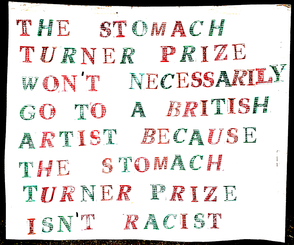The Stomach Turner Prize has repeatedly been assumed to be, but is very much NOT AGAINST THE TURNER PRIZE. Liking or disliking the art in the Turner Prize doesn’t matter. Seeing Tate’s description of the Turner Prize as true or false doesn’t matter. The Turner Prize is a valuable asset to Britain and an institution of significant artistic value.