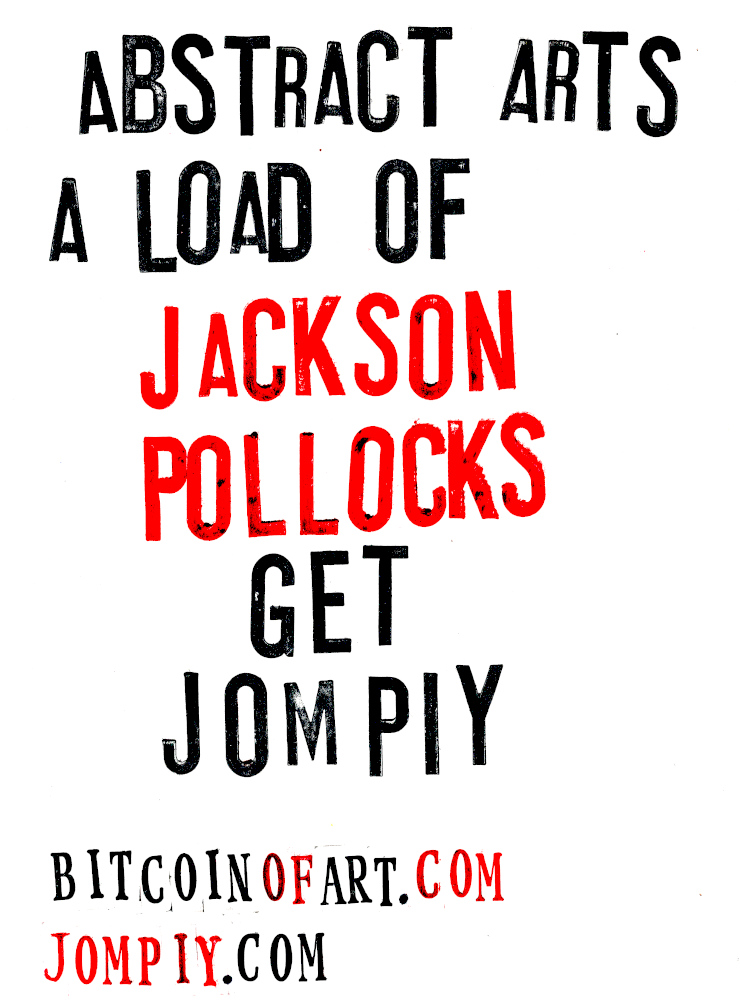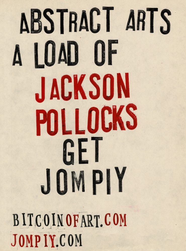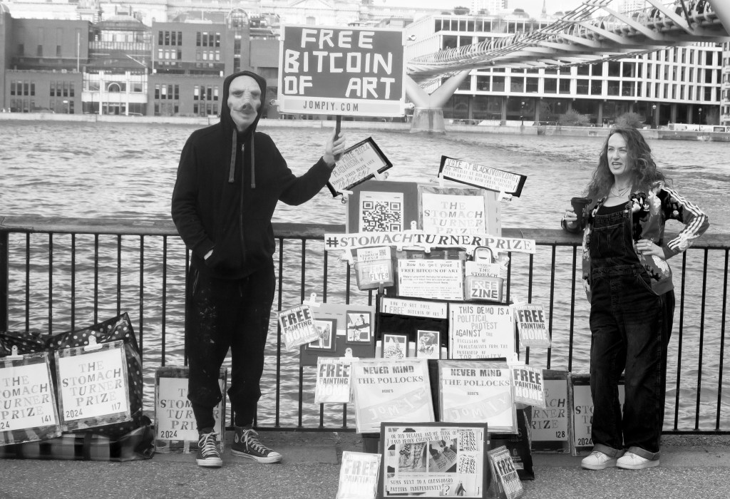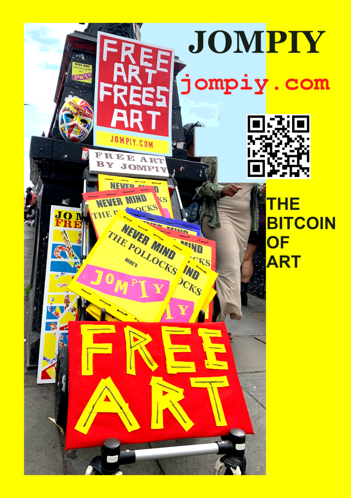 Jompiy wins the first ever Stomach Turner Prize for the Free Bitcoin of Art Installation regularly staged on the busy market streets of Camden. Onlookers and passers by, free to rummage through and walk away with original Jompiy artworks. Take them, they’re free. Highly priced art is pretentious and elitist. Expose this Tate Turner Prize crowd for what it is. Phoney lefties saturated in far-right capitalism they think a bit of woke posturing masks over. An award for emerging artists, my arse. They’re already in major galleries and museums. This is why Britain needs THE STOMACH TURNER PRIZE But what of this Jompiy free art giveaway on the streets of London? From posters glued to cardboard to original oil paintings, all given away en masse from the now-notorious-with-security-guards Jompiy Pushchair of Delights. See the street video interviews with smiling would-be-customers-if-they-had-paid-anything at jompiy.com