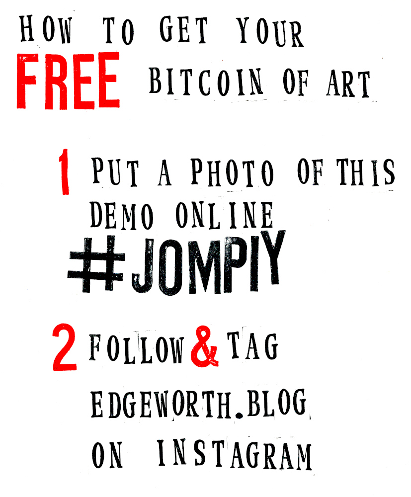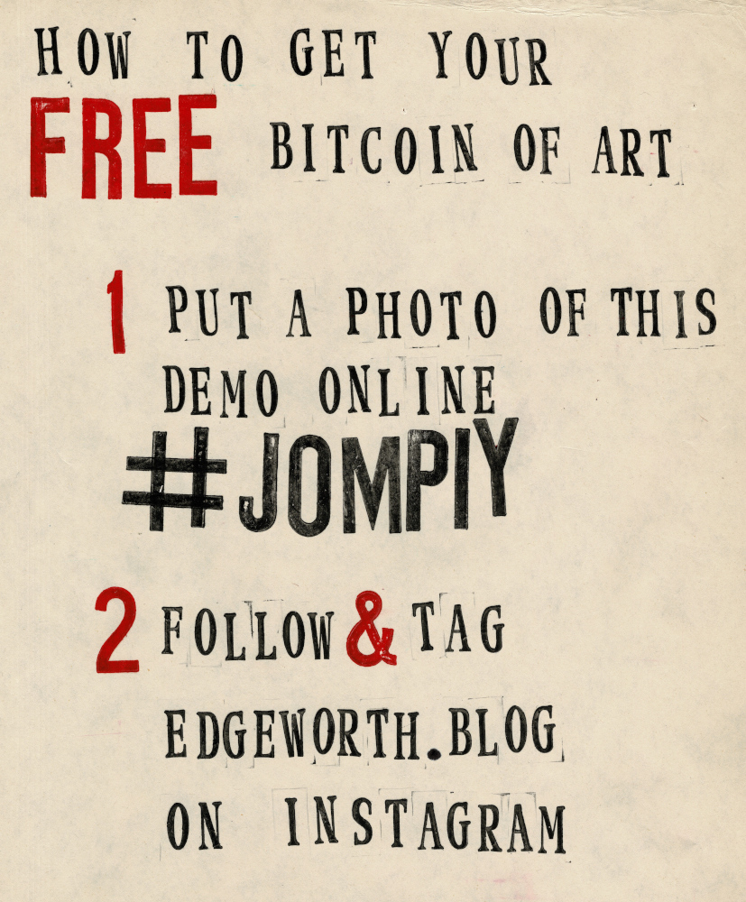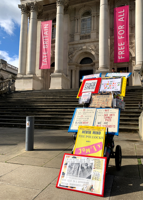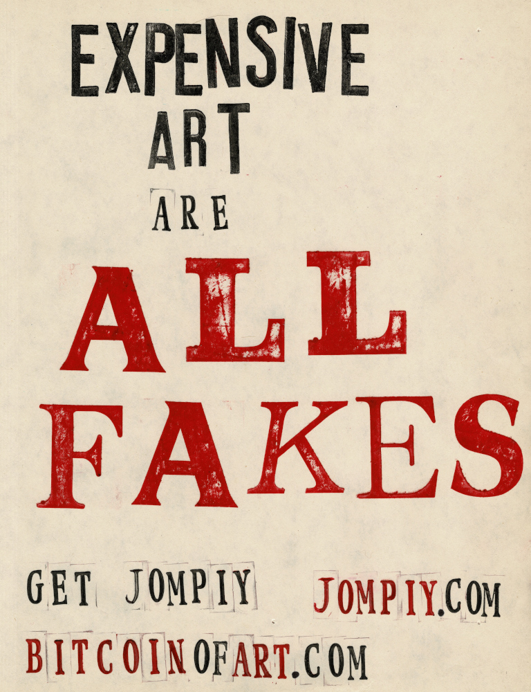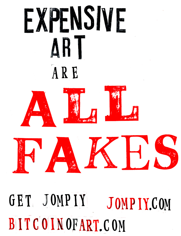Jompiy wins the first ever Stomach Turner Prize for the Free Bitcoin of Art Installation regularly staged on the busy market streets of Camden. Onlookers and passers by, free to rummage through and walk away with original Jompiy artworks. Take them, they’re free. Highly priced art is pretentious and elitist. Expose this Tate Turner Prize crowd for what it is. Phoney lefties saturated in far-right capitalism they think a bit of woke posturing masks over. An award for emerging artists, my arse. They’re already in major galleries and museums. This is why Britain needs THE STOMACH TURNER PRIZE But what of this Jompiy free art giveaway on the streets of London? From posters glued to cardboard to original oil paintings, all given away en masse from the now-notorious-with-security-guards Jompiy Pushchair of Delights. See the street video interviews with smiling would-be-customers-if-they-had-paid-anything at jompiy.com